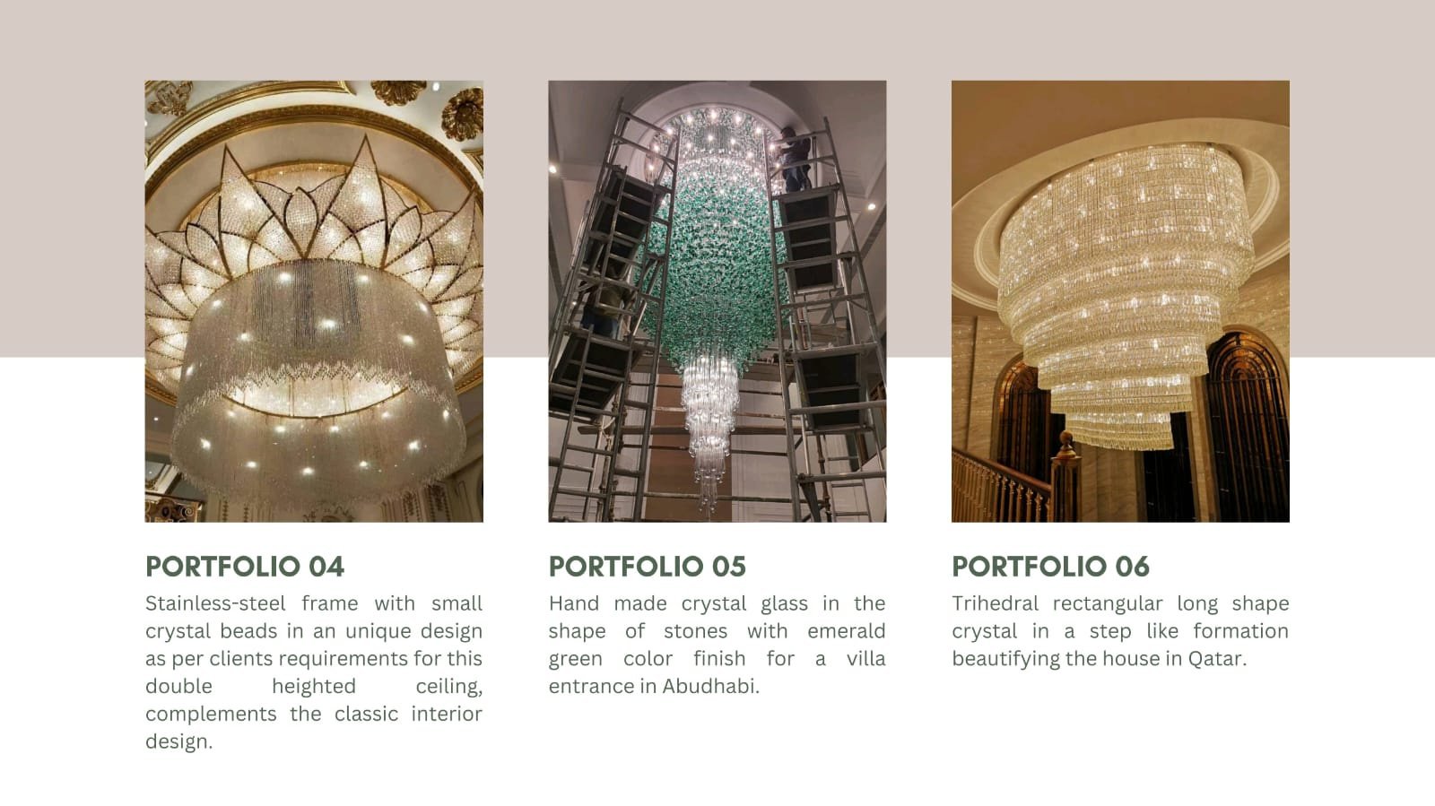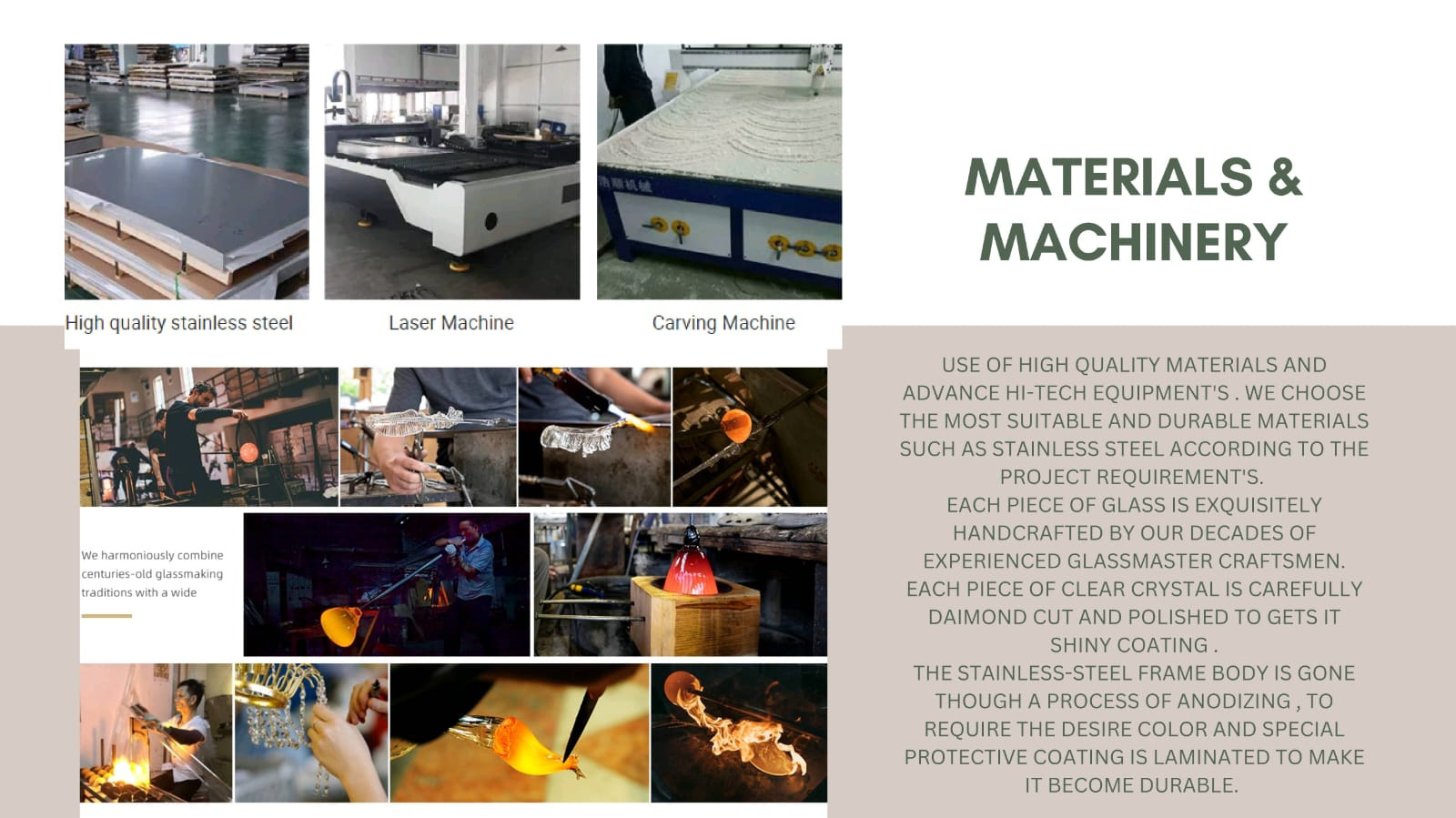 Each n every glass crystal is exquisitely produced & handcrafted by our decades of experienced glass master craftsmen, then our team in the factory work with sophisticated machinery to mold heavy materials to achieve the desired shape, texture and finish, lastly our highly experience professional team expediate the job of installation of chandeliers carefully.